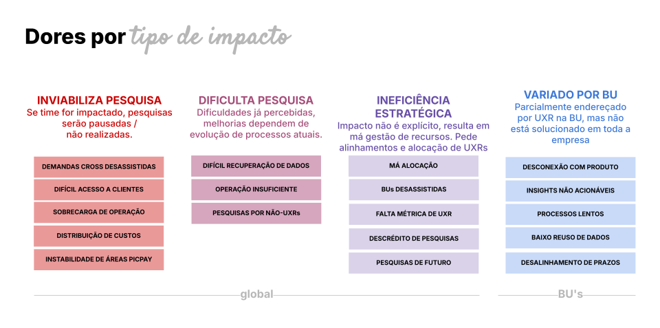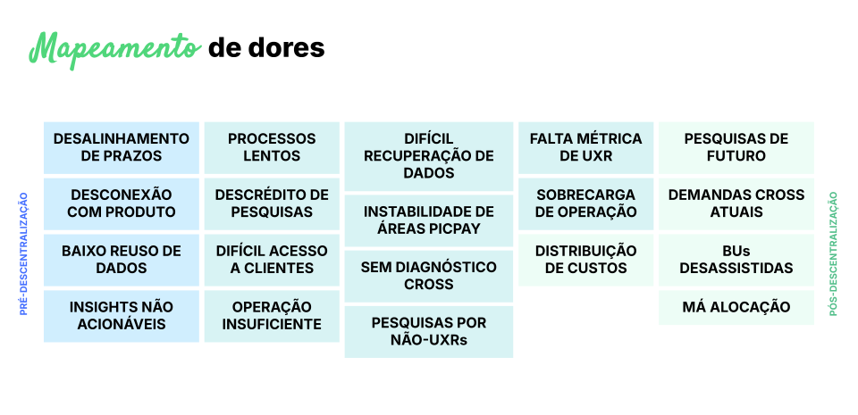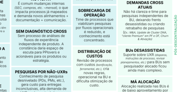 When I joined PicPay, the UX Research team was undergoing a major structural transition. Previously centralized, the team was reorganized into a decentralized model due to several operational challenges and the need for closer integration with product squads. Under the new structure, researchers were directly managed by UX Design leaders within each business unit, while I assumed the role of technical leader for the Research Chapter Operations discipline.