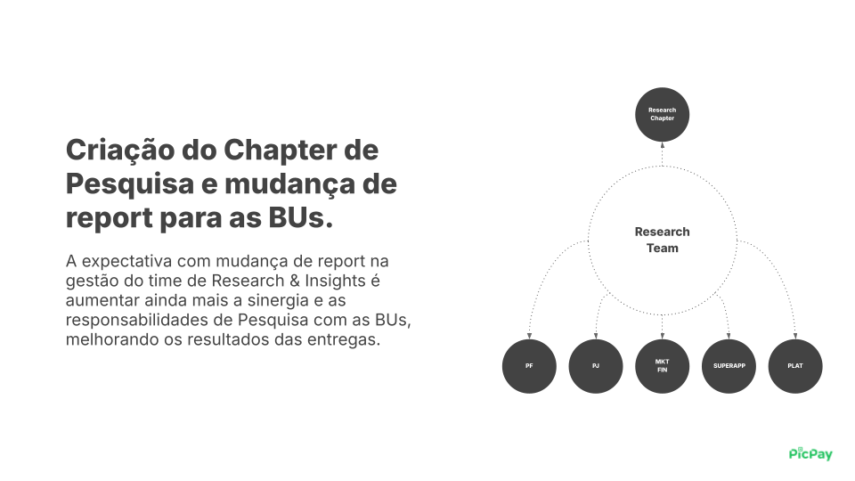 Redefined Research operations post-decentralization, aligning roles, responsibilities, and supporting hiring, allocation, and structure decisions across business units from PicPay.